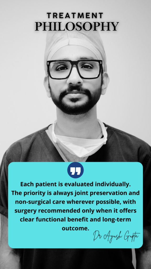 Dr Ayush Gupta is a Sports Injury and Arthroscopy Specialist offering advanced treatment for knee, shoulder and ligament injuries. He focuses on minimally invasive keyhole procedures and modern rehabilitation techniques to ensure faster recovery and early return to work and sport.